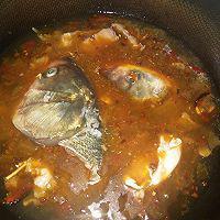 步骤2、 肥肉放锅中炒出油,加入一勺豆瓣酱炒香,放入配料酸菜,姜,蒜,泡辣椒,泡姜,花椒,炒香后倒入水,放鱼头、鱼泡入锅中煮大概7、8分钟。
