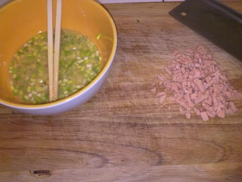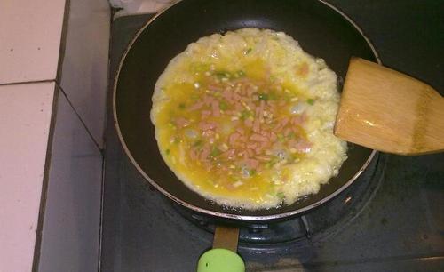 步骤1、鸡蛋打进碗。加盐,打起泡,加葱,加火腿肠丁。