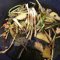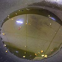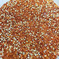 步骤10、 配料捞出来丢掉,油稍稍晾一下,也不能太凉,慢慢分两三次加入辣椒面,边加边搅拌