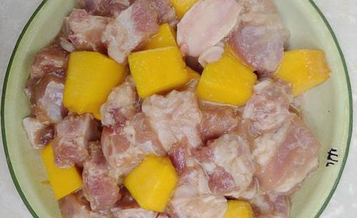 排骨放入盘中,切几小块南瓜,加1匙耗油、1匙酱油、2匙盐、1匙白糖、1匙生粉搅匀腌制10分钟