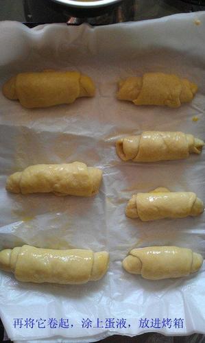 步骤4、将它卷起,涂上蛋液,放进烤箱