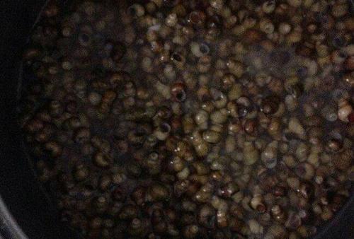 步骤2、锅里倒入清水加适量食盐生姜烧开,倒入清洗干净的田螺,慢慢搅动,让田螺壳盖脱掉又能有点基本味,沥出!