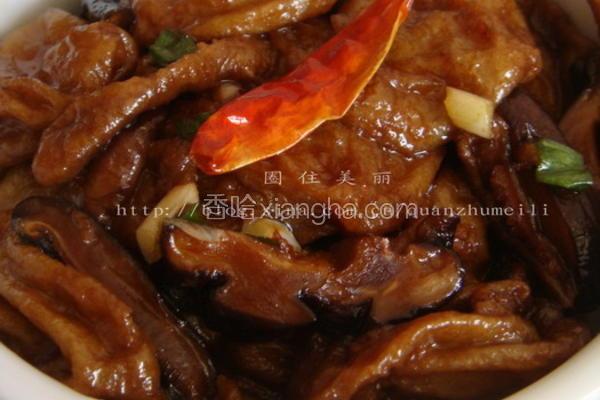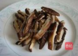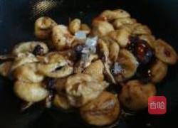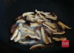 步骤6、翻炒均匀后加入泡香菇的水,中小火焖5分钟。大火收汁,淋上几滴香油,撒上葱末即可。