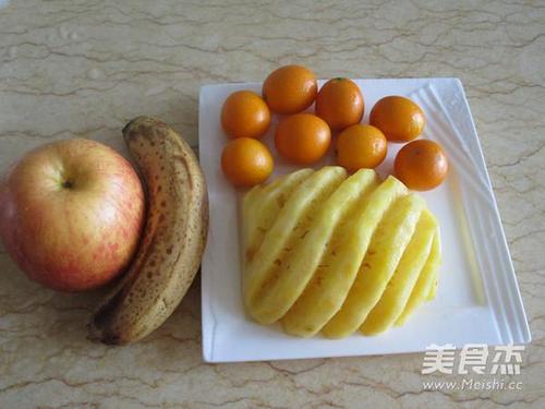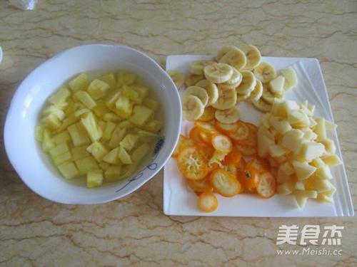 步骤7、把菠萝切丁后泡入淡盐水15分钟后捞起沥干水分,香蕉去皮切丁,苹果去皮切丁,金桔洗净后切薄片