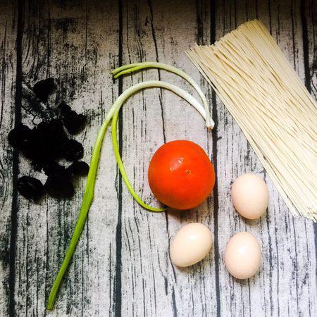 步骤1、准备好食材:西红柿、鸡蛋、面、黑木耳 小葱、食用油、麻油、盐、鸡精