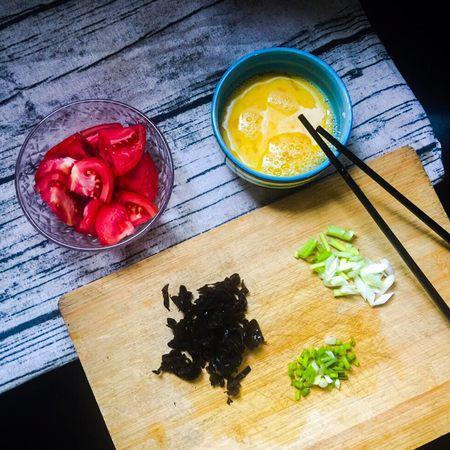步骤2、把西红柿切块、木耳切丝、鸡蛋搅碎、小葱切成葱沫