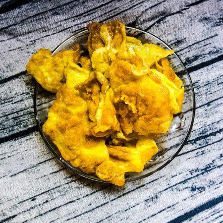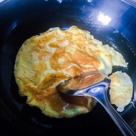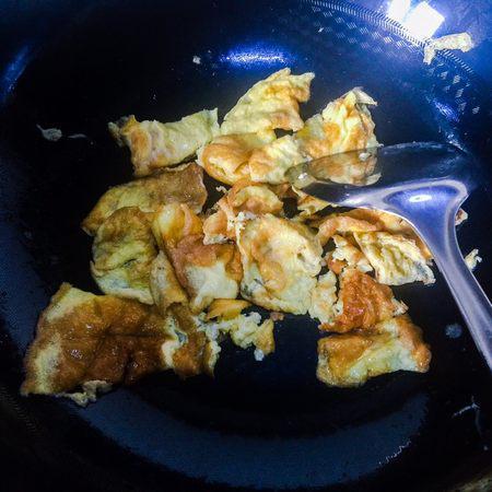 步骤5、鸡蛋饼搅碎成鸡蛋饼块