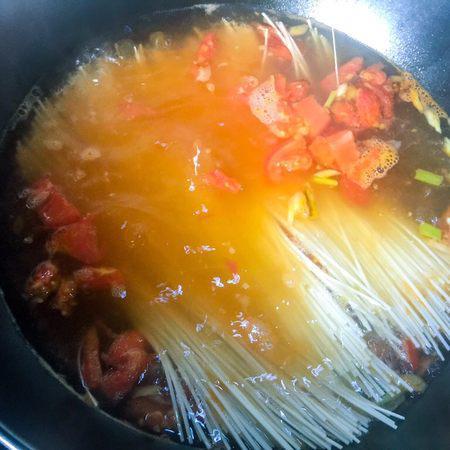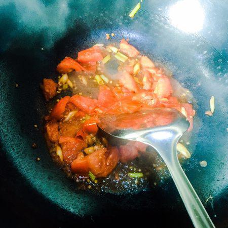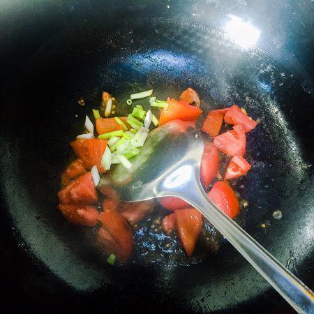 步骤9、把西红柿和小葱翻炒一下,炒出西红柿的汤汁,这样做出来的面,西红柿的汤汁更浓郁好吃。