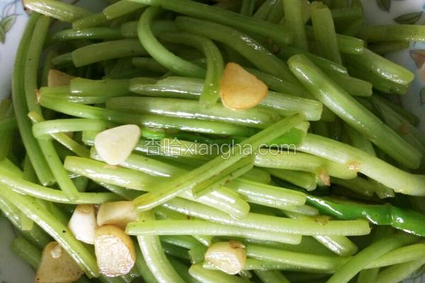 步骤2、掐成大小适中的段,清洗备用,准备佐料,蒜、辣椒,醋适量盐