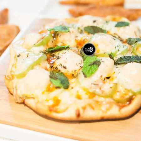 步骤15、撒上薄荷叶作为装饰。香浓芝士口感的薄底披萨,再配些小食,喝点小酒,没有更美妙的假期了。