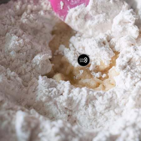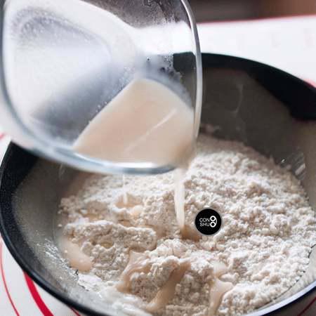 步骤4、 然后倒入酵母液体,与面粉混合均匀。根据面粉的吸水性,再多次少量增加水分,直到碗里的面粉完全揉捏成团。此时的面团触感会有些干,表面并不是很光滑,按压时会裂开。没关系,这样就可以等待发酵了。由于每个品牌的面粉吸水性不同,材料表中给出的用水量只能作为参考。最保险的方法,是通过多次少量的方法增加水分,以达到面粉最合适的干湿度。