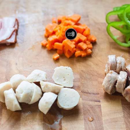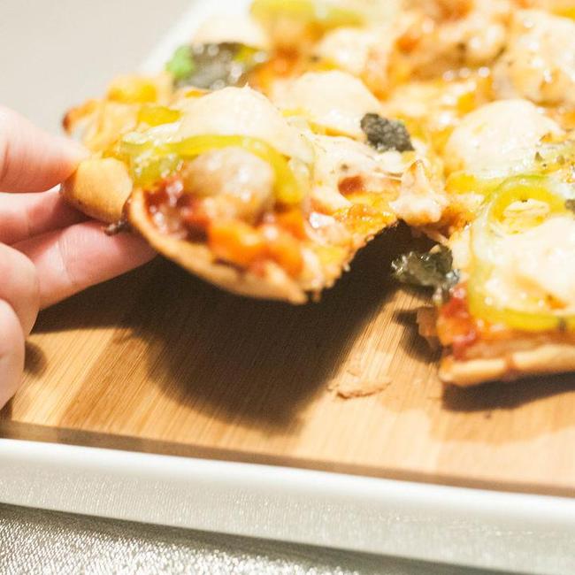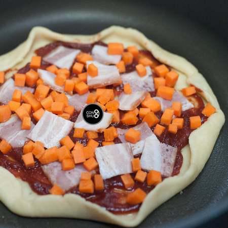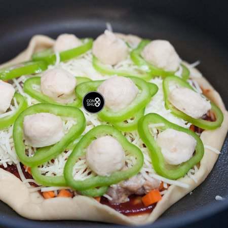 步骤6、所有的蔬菜和肉类都切块或切丁,考虑到平底锅温度低于烤箱的缘故,食材尽量切得小一些,更容易熟。 披萨上放置的蔬菜尽量选择水分较少的品种,以免烹煮时析出的水分过多,与芝士融合后变成一滩湿腻腻的糊糊。如果蔬菜本身水分过多,也可以事先在锅内翻炒一下,蒸发去多余的水分。大个头的肉丸,也可以事先汆水成半熟状态备用。