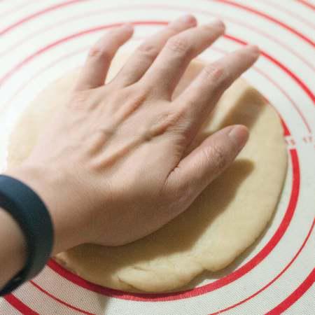 步骤8、饼底按压推捏开,成6~7mm厚的圆形。饼底的传统做法会通过甩面皮(类似抛甩手帕)的手法,让面皮变得薄且均匀,但对于第一次尝试的朋友来操控性略低,建议先通过手来按压,然后借助擀面杖将其制成理想的形状。