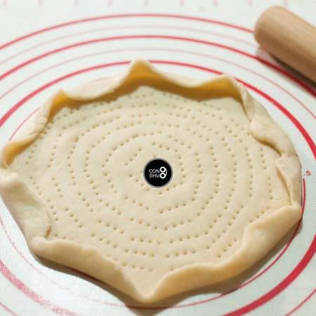 步骤9、擀好的饼底,用叉子在上面均匀戳出小孔,便于烘烤时透气。饼边等距离卷起,可以防止堆砌过多馅料时,topping滑落。