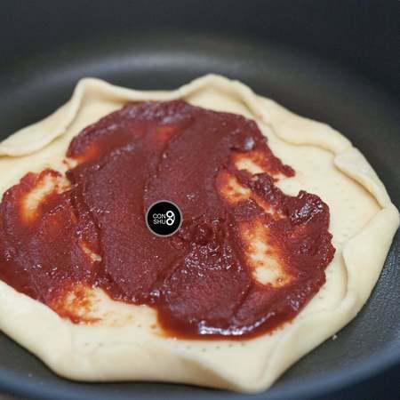 步骤10、锅底抹一层油,放入饼皮。抹上厚厚的番茄酱。