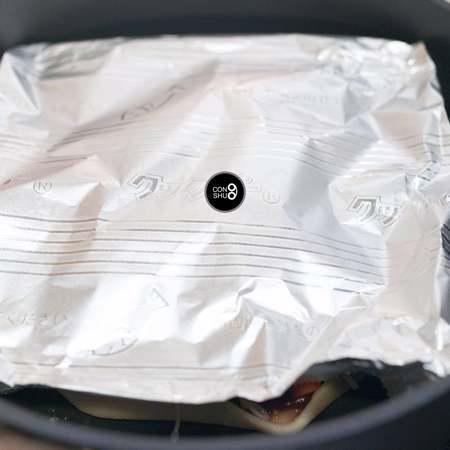 步骤14、最后在披萨上面覆上一层铝箔纸,模拟烤箱的效果,让锅内热量更为聚集,并反射集中到披萨上。 大火把锅烧热后,小火哄15分钟左右。待饼皮变硬,底层的番茄汁渗透出芝士层,慢慢冒泡,就可以出锅了。