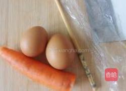 步骤10、把兔子耳朵放在刚切好的凹槽里,将胡萝卜(番茄皮)剪成圆形,就是兔子的眼睛了。