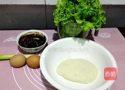 步骤1、面粉用温水和软盖上保鲜膜放一边备用(头天晚上和好没有酵母不会发酵,第二天早上用面松驰最佳),生菜洗净,黄豆酱用香油调匀,鸡蛋和葱备上