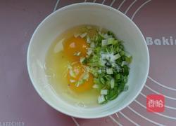 步骤2、鸡蛋磕入碗中,葱切碎放入鸡蛋中在放入少许盐,用筷子打散备用