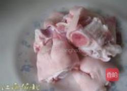 步骤1、猪蹄一只、洗净斩成块、家里没有砍刀买时让给剁好的、所以只能是这样的图、洗净后放入开水锅中飞水、不要太久、去除杂质和血沫、捞出放清水中冲洗干净。