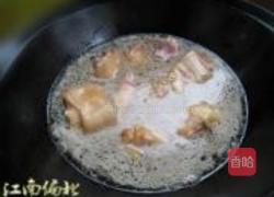 步骤4、倒入开水放一点盐、几滴酱油(多了就会黑)一点葱、姜、大火烧开、小火慢炖时间要久、用高压锅省时省力但味道和这样炖出来的截然不同、最后大火收汁。