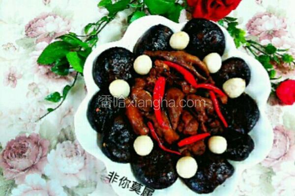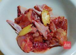 步骤1、三黄鸡剖腹清洗干净剁成块,用生姜两片少许食用油,料酒!十三香,盐,1茶匙生粉腌制半小时。香菇凉水浸泡半小时焯水备用。焯水的香菇不要捏干。鹌鹑蛋煮熟拨壳备用。