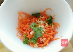 步骤4、将挤干水分的胡萝卜丝,连同香菜和蒜末放入大碗中