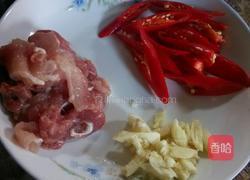 步骤3、猪肉切薄,辣椒切细!蒜头先拍碎!再切细。