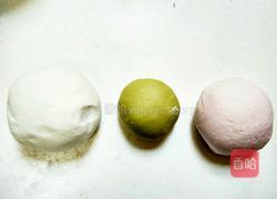 步骤3、取一小块和好的面团放开水里烫成熟面和生面团揉匀。白色面团也这样 。