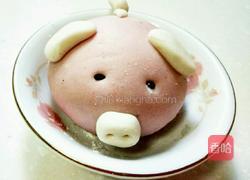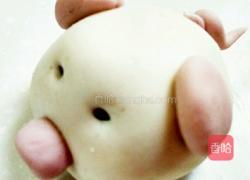 步骤4、白色面团搓圆压扁后放入芝麻馅,然后收口搓圆。然后用粉色的面团捏出两个耳朵一个鼻子,鼻子用牙签戳猪鼻孔。