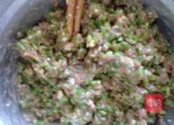 步骤1、选一块肥三瘦七的猪肉,剁成肉糜,洗净韭菜苔,切成细末,姜切末,加入盐、少量酱油,加入适量食用油,稍加一点水,搅拌成菜馅。