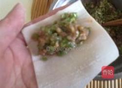 步骤3、取一张馄饨皮,用筷子挑上搅拌好的肉馅放在面窄的那头,卷起来,包好