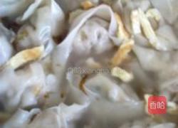 步骤4、包好了馄饨,用一个鸡蛋做出蛋皮放到一边凉着,锅里添加适量的水,水开后,先用大勺子将水搅开成旋涡状再慢慢下入包好的馄饨,盖锅煮沸,中间适时用大勺子推一下,水开后不再盖锅盖点入凉水煮制看到馄饨鼓起来。撒入葱末紫菜,切成细丝的的鸡蛋皮等