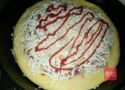 步骤6、最后放一层厚厚的马苏里拉,上面挤番茄酱,饼的边缘刷鸡蛋液
