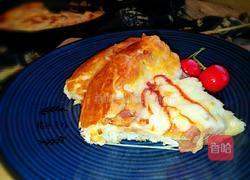 步骤5、中间,先放一层马苏里拉,再把培根,胡萝卜,香菇均匀洒满,再撒洋葱丝