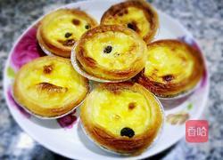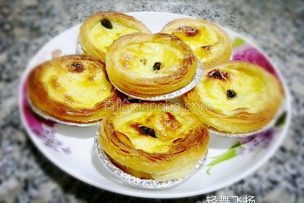步骤4、每个蛋挞皮放五粒葡萄干倒入蛋挞液,至七至八分满,放入烤盘