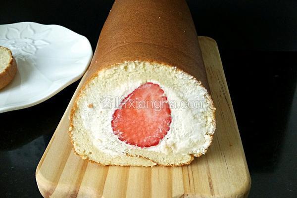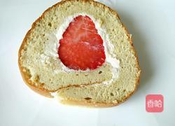 步骤9、切掉边缘不漂亮的两头边边。正好露出了草莓,还是蛮漂亮的嘛。蛋糕卷就这样做好了。