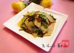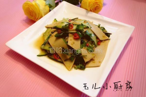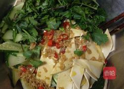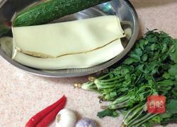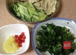 步骤3、煮好的千张凉一凉和黄瓜一起切成棱形片,香菜切小段,蒜压泥,小米辣切碎。