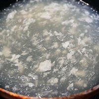步骤6、 清水中放入盐、糖、味精,煮沸后倒入少许蛋清做成蛋花,加入淀粉水勾芡
