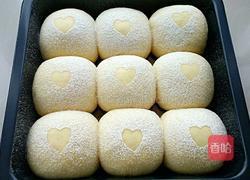 步骤10、用油纸剪成心形的小纸片,放在面包生坯的中间,在上面筛适量面粉。