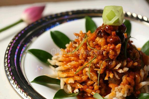 步骤3、炸鱼用的底油,加入番茄酱炒出红油后加入番茄沙司,二者比例是2:1,再依次加入胡萝卜碎、香菇碎、白醋、水淀粉,不停搅拌后,放到油锅炸汁。