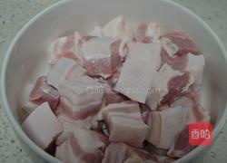 步骤2、切成3厘米左右的方块,放入冷水中浸没,倒入25克料酒,浸泡15分钟,泡出毛细血管中血水。