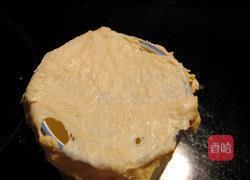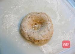 步骤7、把面稍压扁,用手指在中间稍戳一个洞,但不要戳穿,然后边拉边转着向外扩展,把里面的那层膜拉大,点上用原材料五香粉1/2茶匙、盐1茶匙、水3汤匙兑成的盐水,撒上芝麻,再就手按一按芝麻;