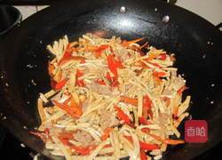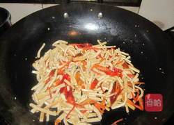 步骤2、将切好的豆腐丝放进烧好油的锅里,香炒