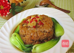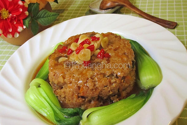 步骤7、关火~将作法6淋在蒸好的肉上头, 週围摆上烫熟的青江菜即完成料理