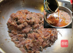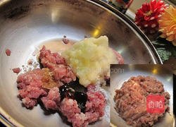 步骤3、取一深盆, 放入猪绞肉, 洋葱泥,调味料搅拌均匀入味