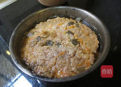 步骤4、放入红萝卜丝及黑瓜搅拌拌匀(若太稀可视情况加些太白粉);将盆内材料移到蒸锅容器, 压平后倒入黑瓜酱汁...