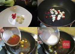 步骤6、取一平底锅, 加入油, 辣椒末, 蒜末小火爆香, 待闻到香气后倒入作法5的酱汁转大火煮至滚, 再倒入勾芡水拌匀...