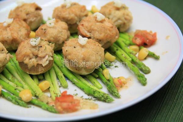 将芦笋跟酿好鲔鱼沙拉的蘑菇放进气炸锅里面,在洒上一些黑胡椒。小提醒:先铺一层铝箔纸在气炸锅内,可以防止内网难以清洗。