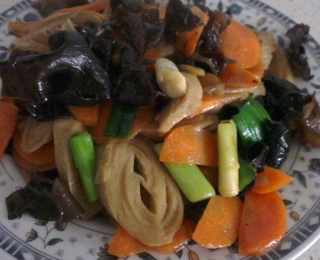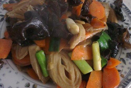 步骤2、锅内热油,下葱姜微炒,入胡萝卜翻炒,下面筋、木耳、青蒜翻炒至7成熟,加盐翻炒拌匀(也可加几滴红烧酱油上色)。盛出即可!